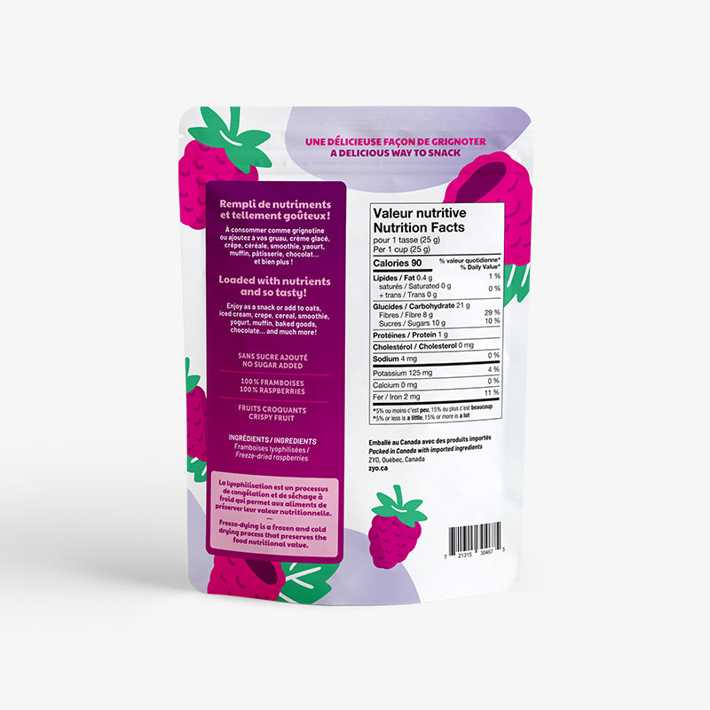 At Zyo, we offer you high quality freeze-dried raspberries. No additives, artificial colours or flavours, just fruit!